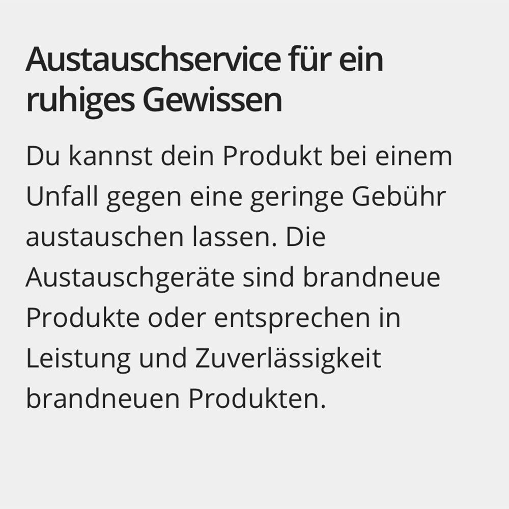 - Bietet bis zu zwei Austauschgeräte innerhalb von 24 Monaten bei versehentlichen Schäden einschließlich eines Flyaway-Vorfällen (1. Austauschgebühr 159€, 2. Austauschgebühr 199€, 3. Austauschgebühr 219€ und bei Flyaway 699€ Gebühr)