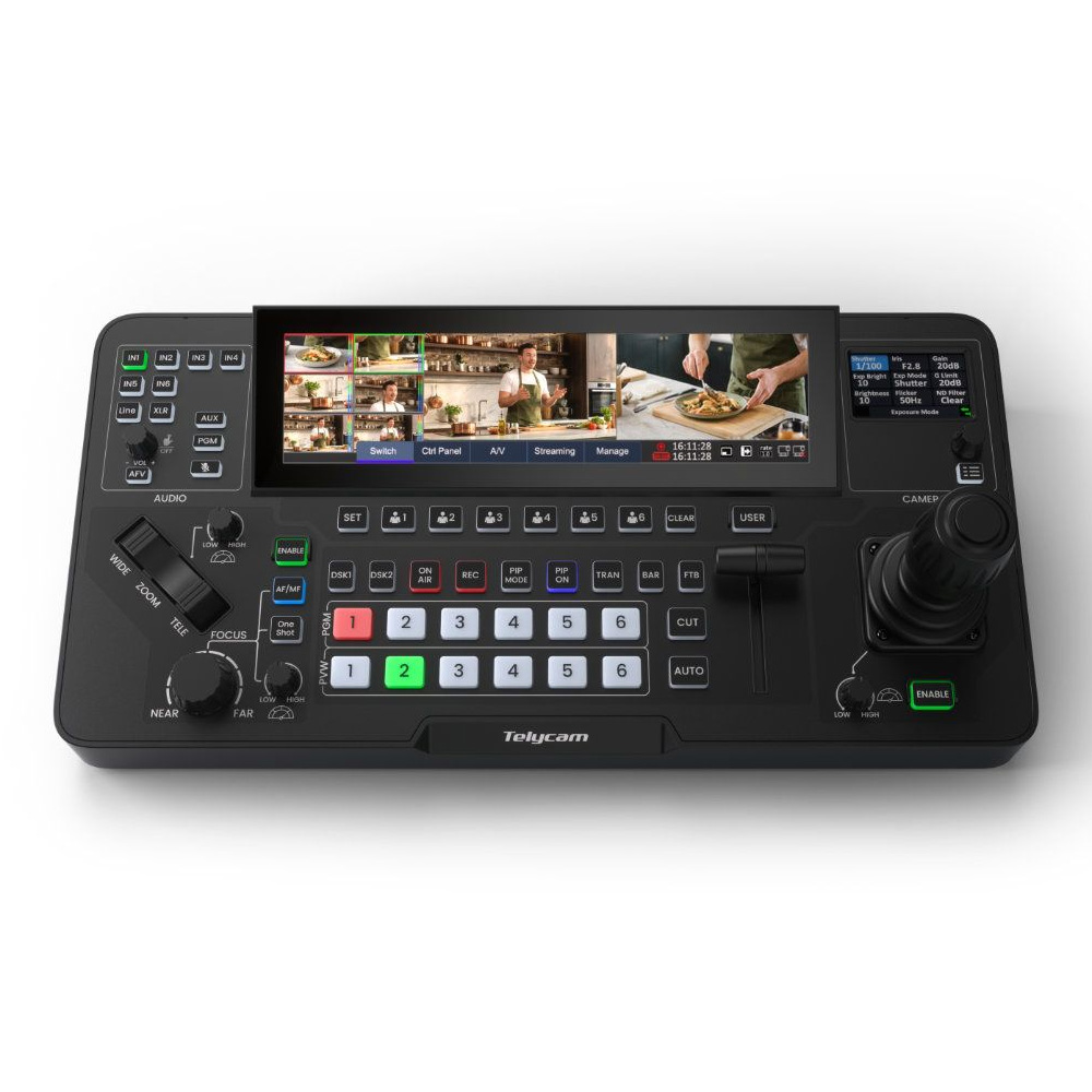 - Integrierter 8,8"-Touchscreen für die zentrale Steuerung von Video-Switching, Audio-Mixing und System-Settings